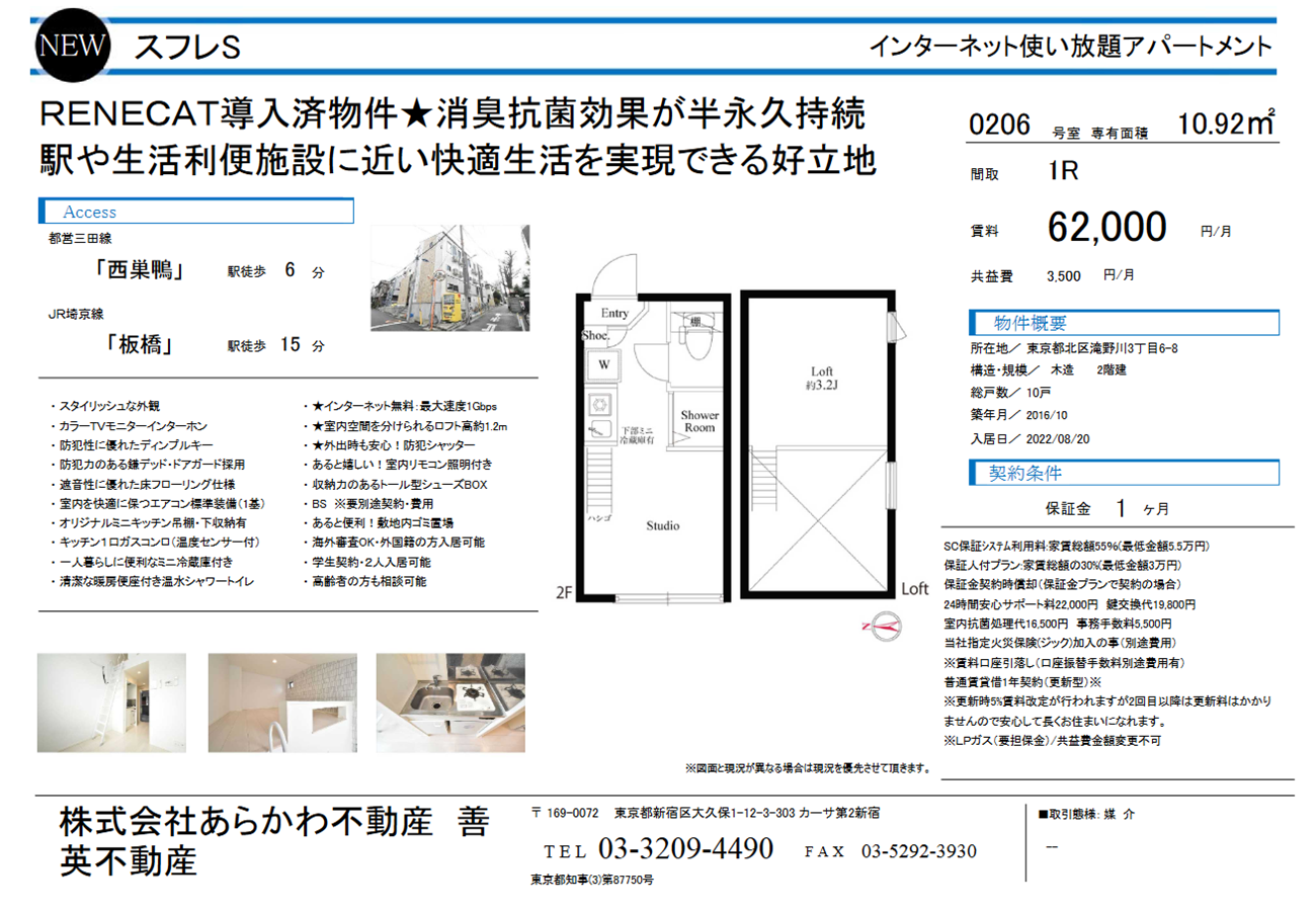 [스크랩] [추천2 한국가능](보1-상각)키타구 미타선 니시스가모역 6분 사이쿄선 이타바시역 15분 2016년축 스후레S(206호-62000엔+3500엔)10.92