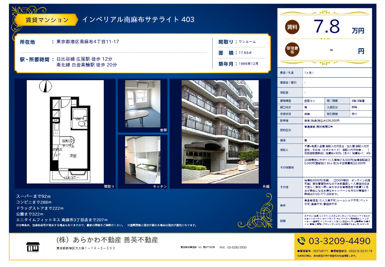 [스크랩] [추천2 한국가능](시1/레0)미나토구 히비야선 히로오역 12분 1995년築 임페리얼미나미아자부사테라이토(403호-78000엔)17.93㎡