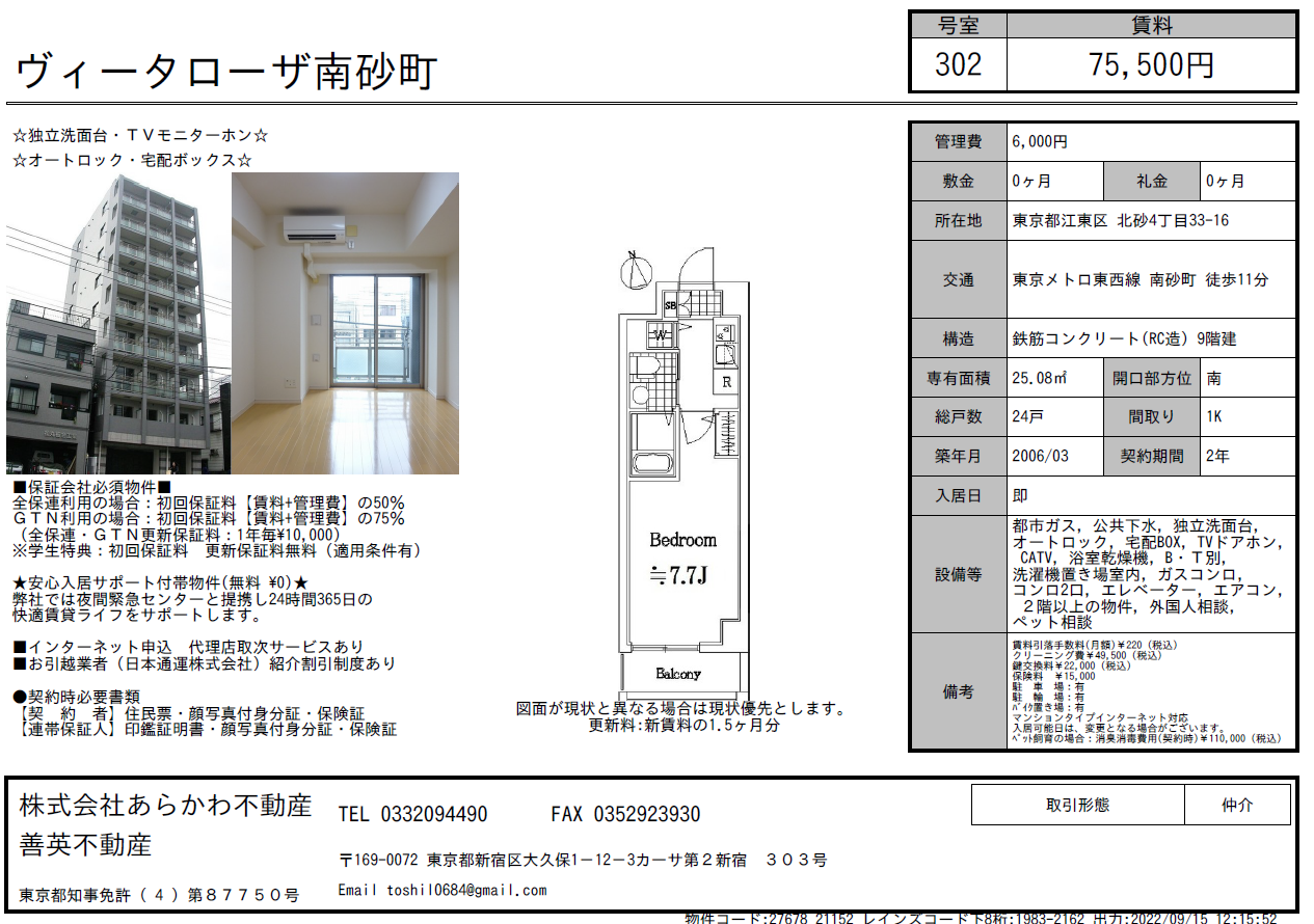 [스크랩] [한국신청가능](시0/레0)코토구 토자이선 미나미스나마치역 11분 2006년築 비타로자미나미스나마치(302호-75500엔+6천엔)25.08㎡