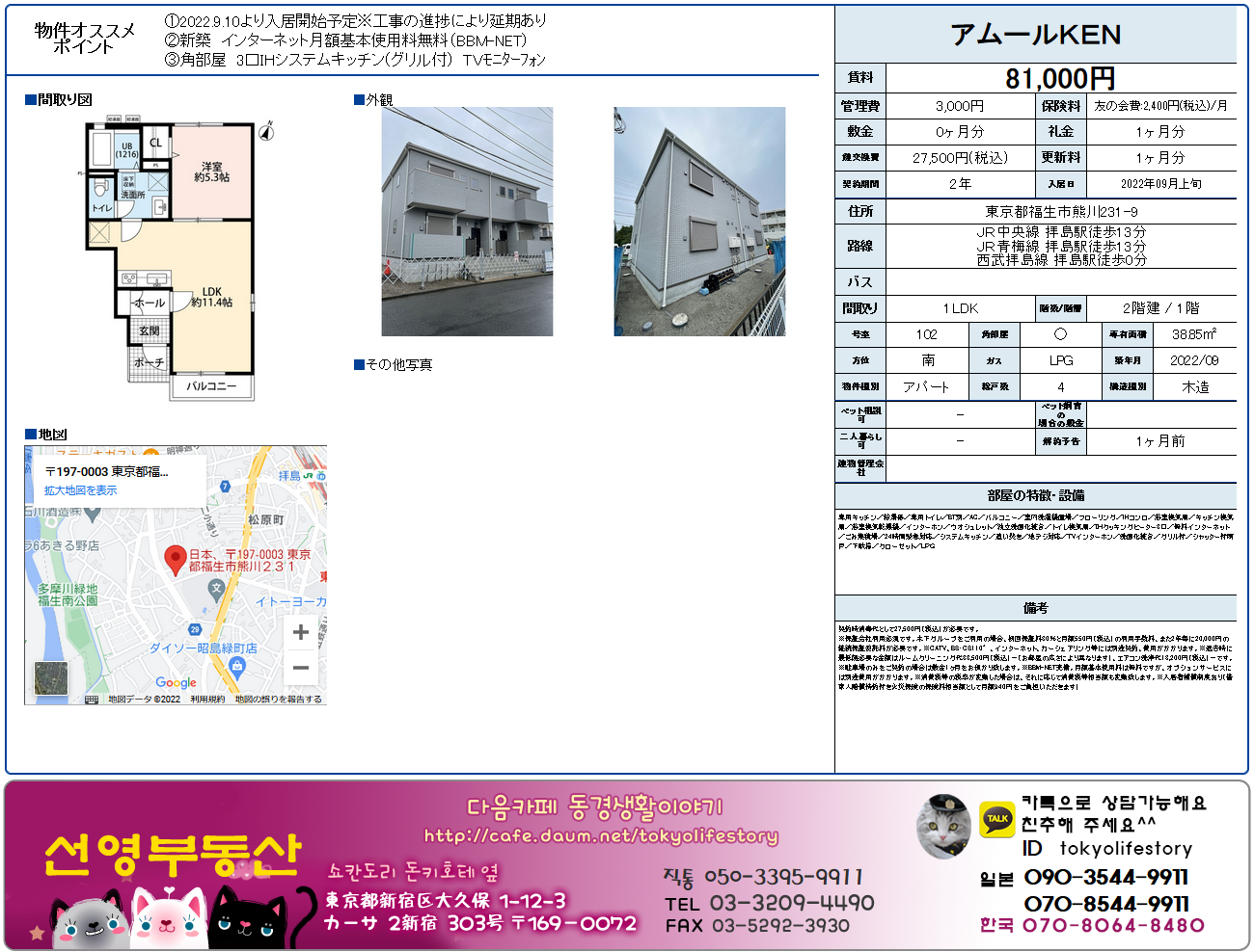 [스크랩] [한국신청가능]신축(시0/레1)도쿄 훗사시 츄오선 아키시마역 13분 2022년축 아무르KEN 1LDK(102호-81000엔+3천엔)38.85㎡