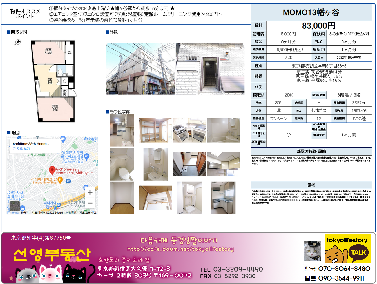 [스크랩] [한국신청가능](시0/레1)시부야구 케이오선 하타가야역 8분 1967년축 MOMO13하타가야 2DK(304호-83000엔+5천엔)35.57㎡