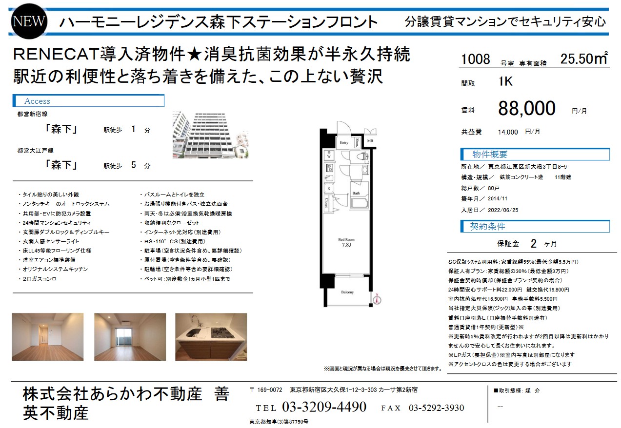 [스크랩] [추천2-한국가능](보2-상각)코토구 모리시타역 토에이신주쿠선 1분 2014년축 HR모리시타스테션후론트(1008호-88000엔+14000엔)25.50㎡