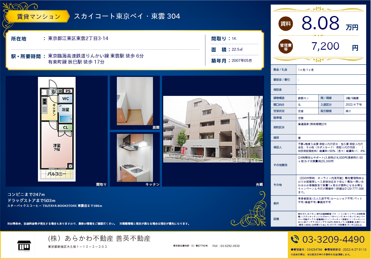 [스크랩] [추천2-한국가능](시1/레1)코토구 린카이선 시노노메역 5분 유락쵸선 14분 2007년 SC도쿄베이시노노메(304호-80,800엔+7,200엔)22.5