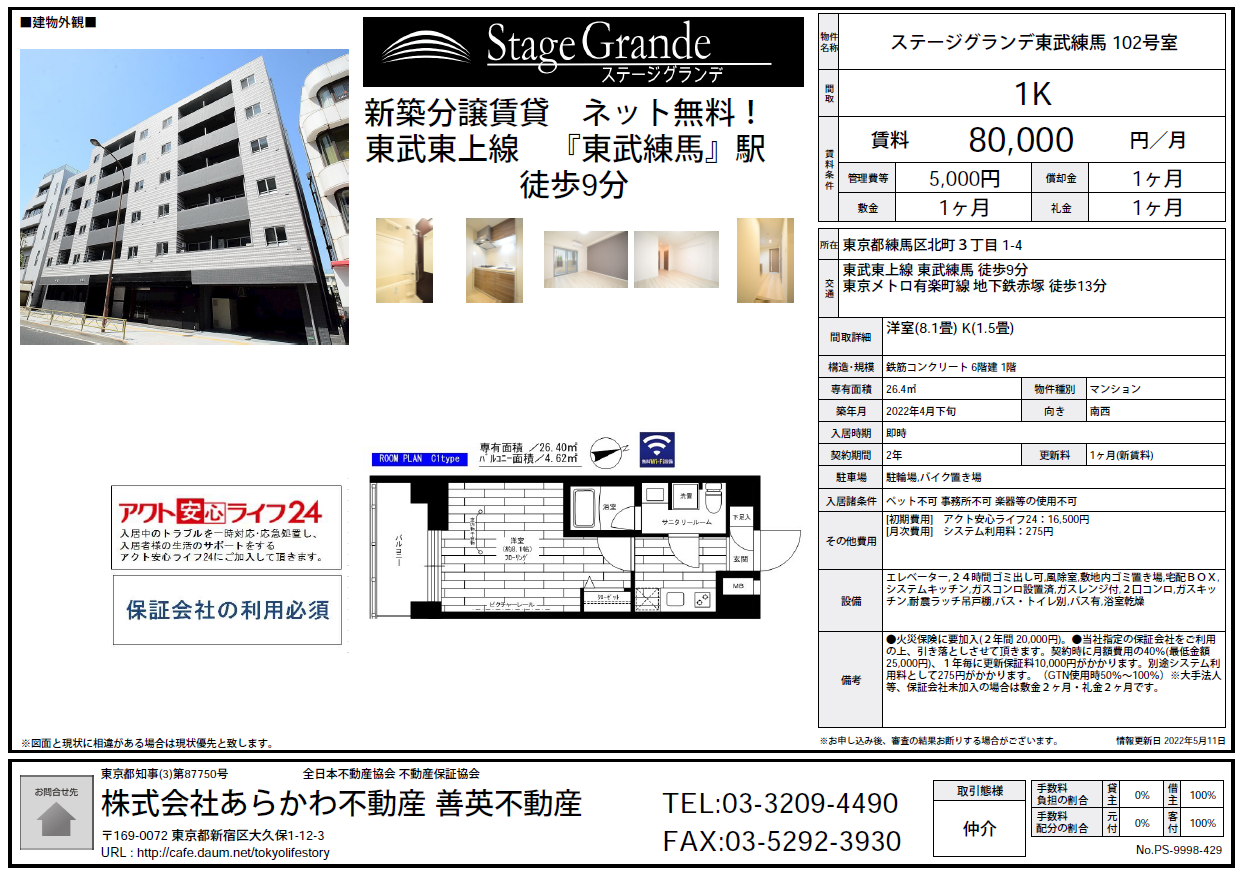 (시1-상각/레1)도쿄 네리마구 토부토죠선 토부네리마역 9분 유락쵸선 치카테츠아카츠카역 13분 2022년 SG토부네리마 1K(102호-8만엔+5천엔)25.79㎡ 인터넷무료