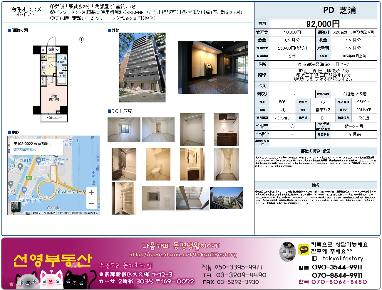 [스크랩] [한국신청가능](시0/레1)미나토구 야마노테선 타마치역 15분 미타선 19분 2019년축 PD시바우라(506호-92,000엔+만엔)25.92