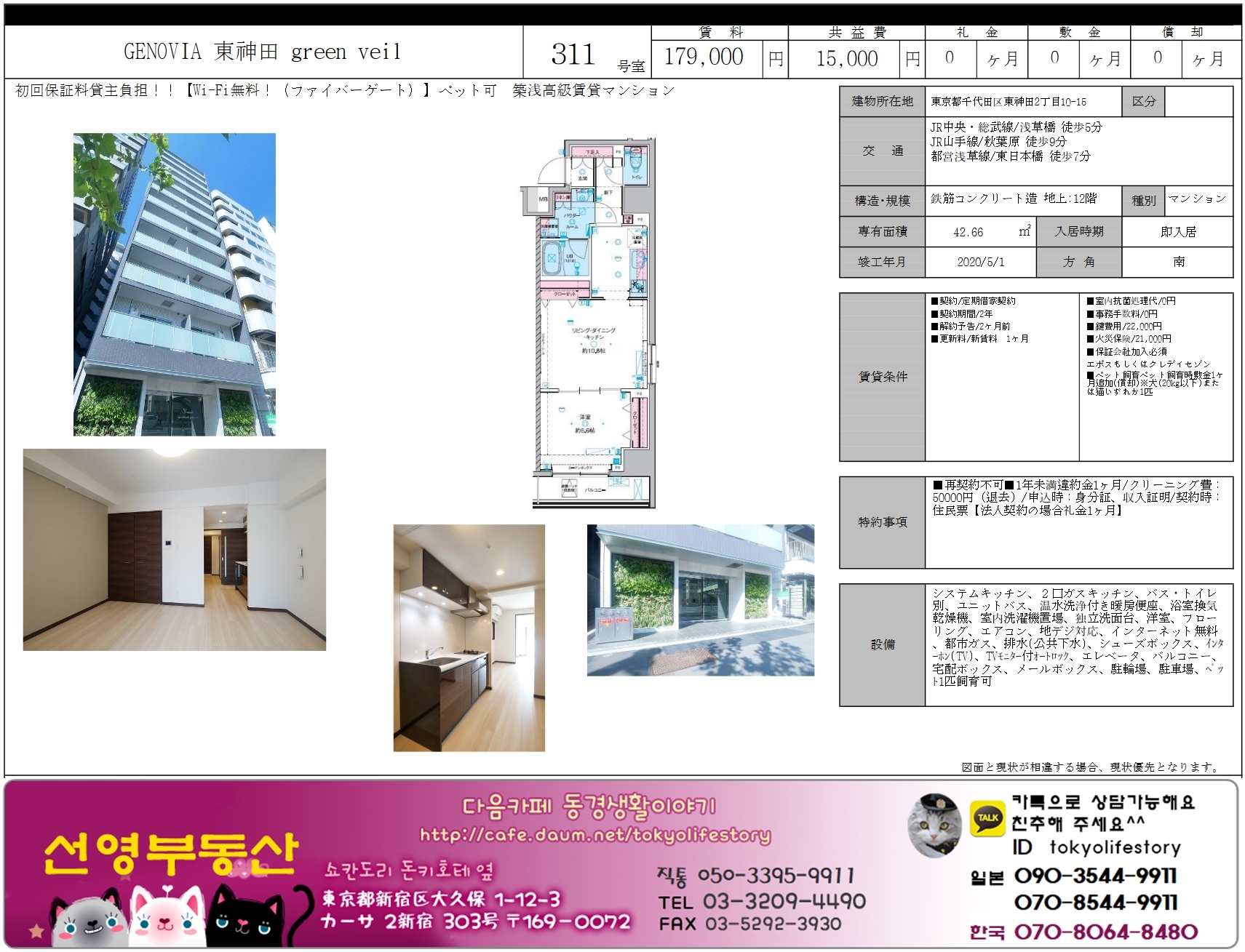 [스크랩] [추천2-한국가능](시0/레0)치요다구 츄오소부선 아사쿠사바시역 5분 2020년 GENOVIA東神田그린베일(311호-179,000엔+1.5만엔)42.66