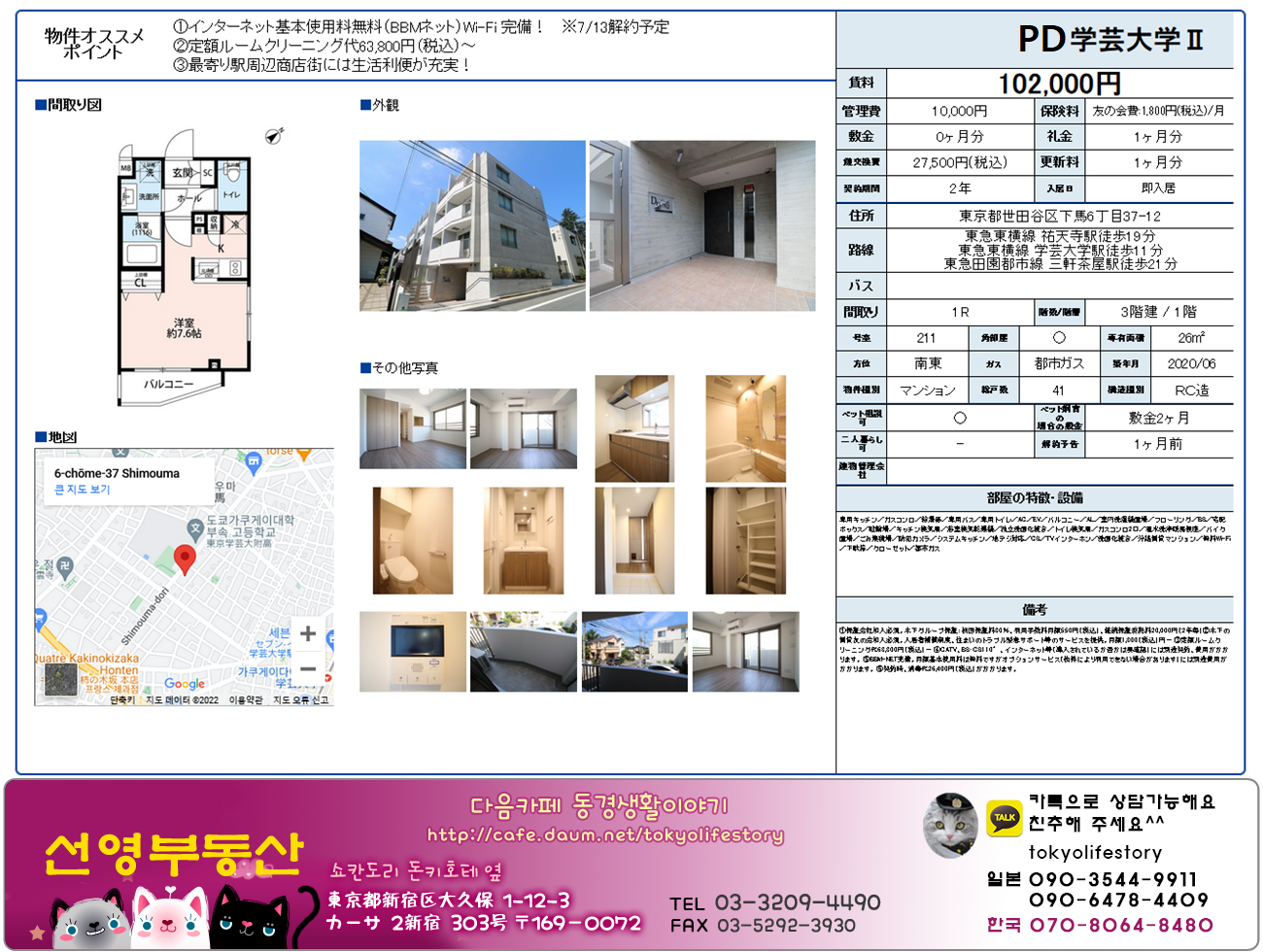 [스크랩] [한국신청가능](시0/레1)세타가야구 토큐토요코선 유텐지역 19분 2020년축 PD가쿠게다이가쿠2(311호-102,000엔+만엔)26㎡펫가 넷무료