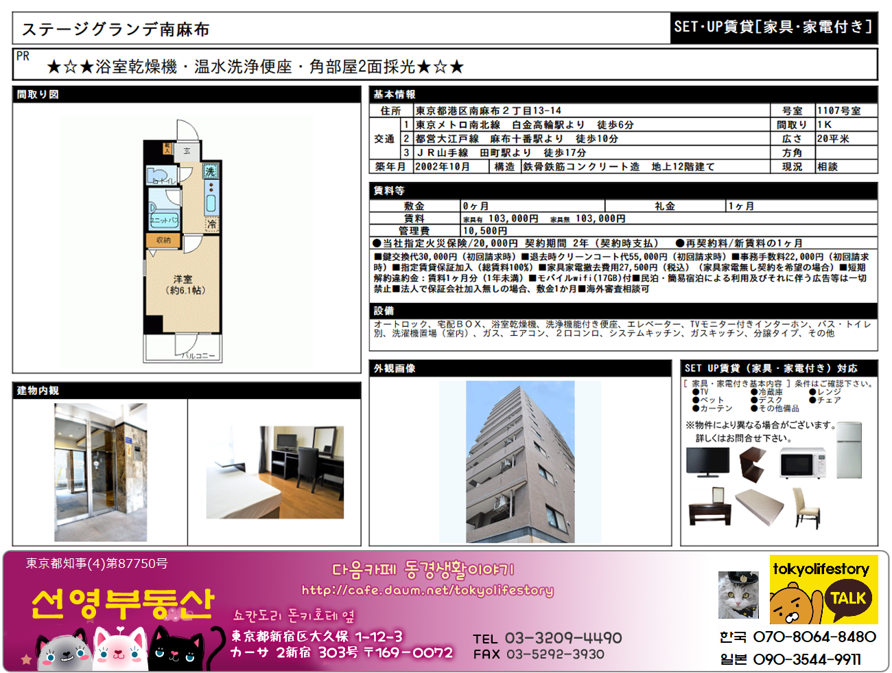 [스크랩] [한국신청가능]풀옵션(시0/레1)미나토구 남북선 시로가네타카나와역 6분 2002년축 SG미나미아자부(1107호-10300엔+10500엔)20㎡
