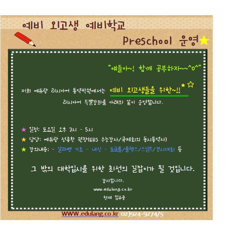 ★ Russia예비 외고생 예비학교 Preschool 운영 ★ 작성자러시아어에듀랑통역학원|작성시간12.12.04|조회수3 목록 댓글 0 글자크기 작게가 글자크기 크게가 다음검색 현재 게시글 추가 기능 열기 북마크 공유하기 신고 센터로 신고 댓글 댓글 0 댓글쓰기 답글쓰기 댓글 리스트