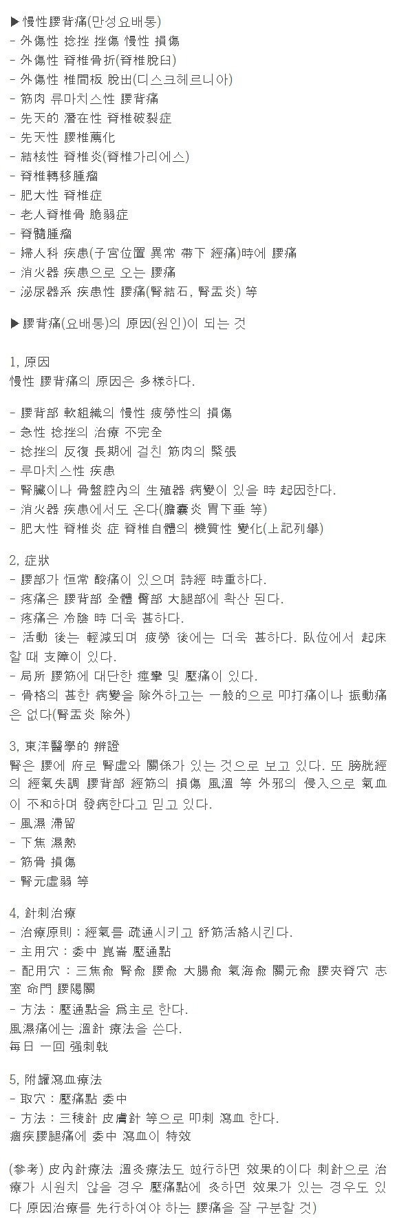 요통(腰痛)은 주로 허리부위의 통증, 풍사, 한기, 습기 또는 염좌등에서 기인한 것이다.