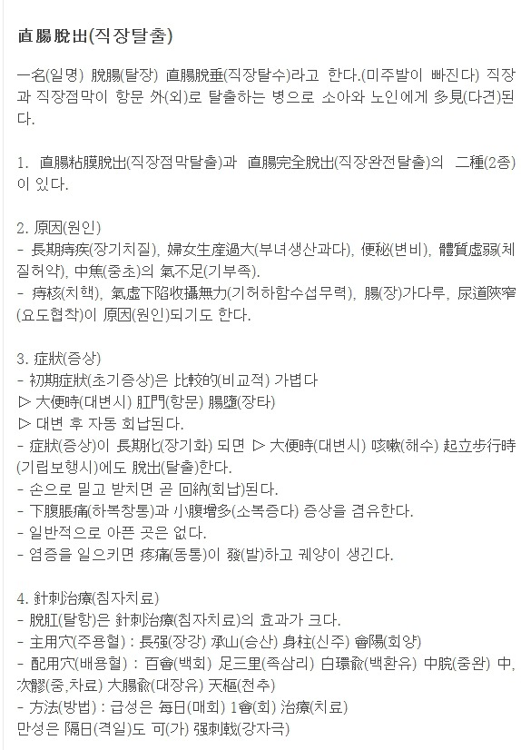 ? 백회(독), 대장유(방광), 신궐(임), 기해(임), 장강(독), 족삼리(위) : 탈항을 치료 할 때는 탈출된 부위를 매번 5% 식염수 또는 명반수로 깨끗이 세척한 다음 치료 해야 한다.