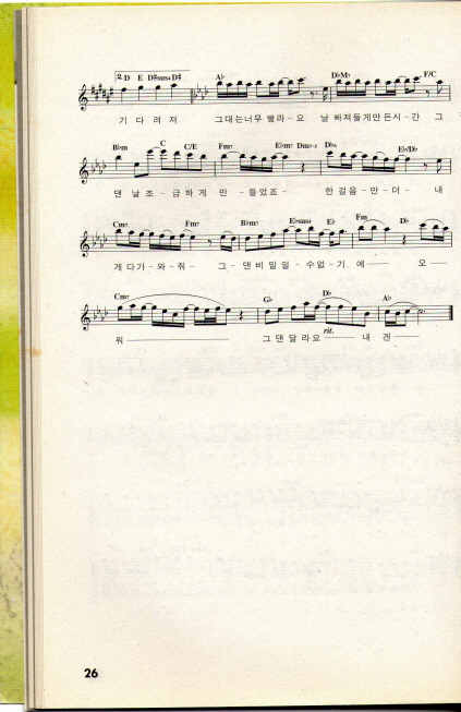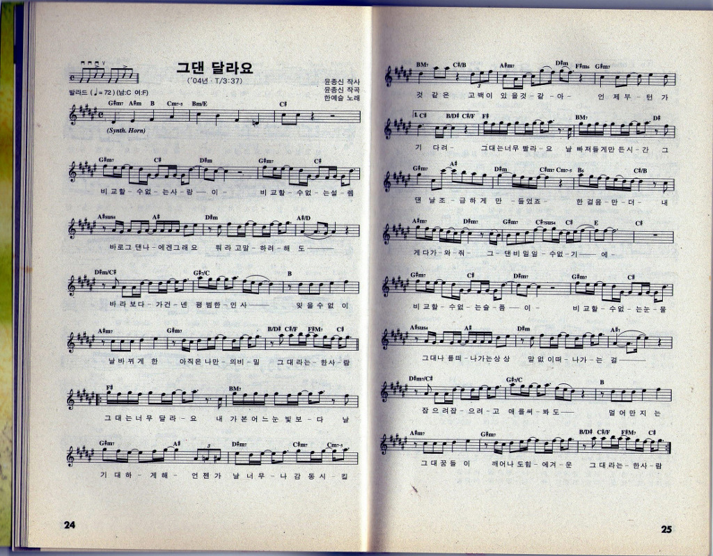 악보 책 뒤적거리다 보니 한예슬이 부른 그댄달라요 원곡 코드가 있길래 올려봅니다 ㅎㅎ 복사는 막아놨고 스크랩만 가능하게 해놨으니까요 필요하신 분 스크랩 해가세요 ㅎㅎ 저작권 문제 어쩌고 해서리 조심스럽네요 문제 생기면 내리겠습니다ㅋ
