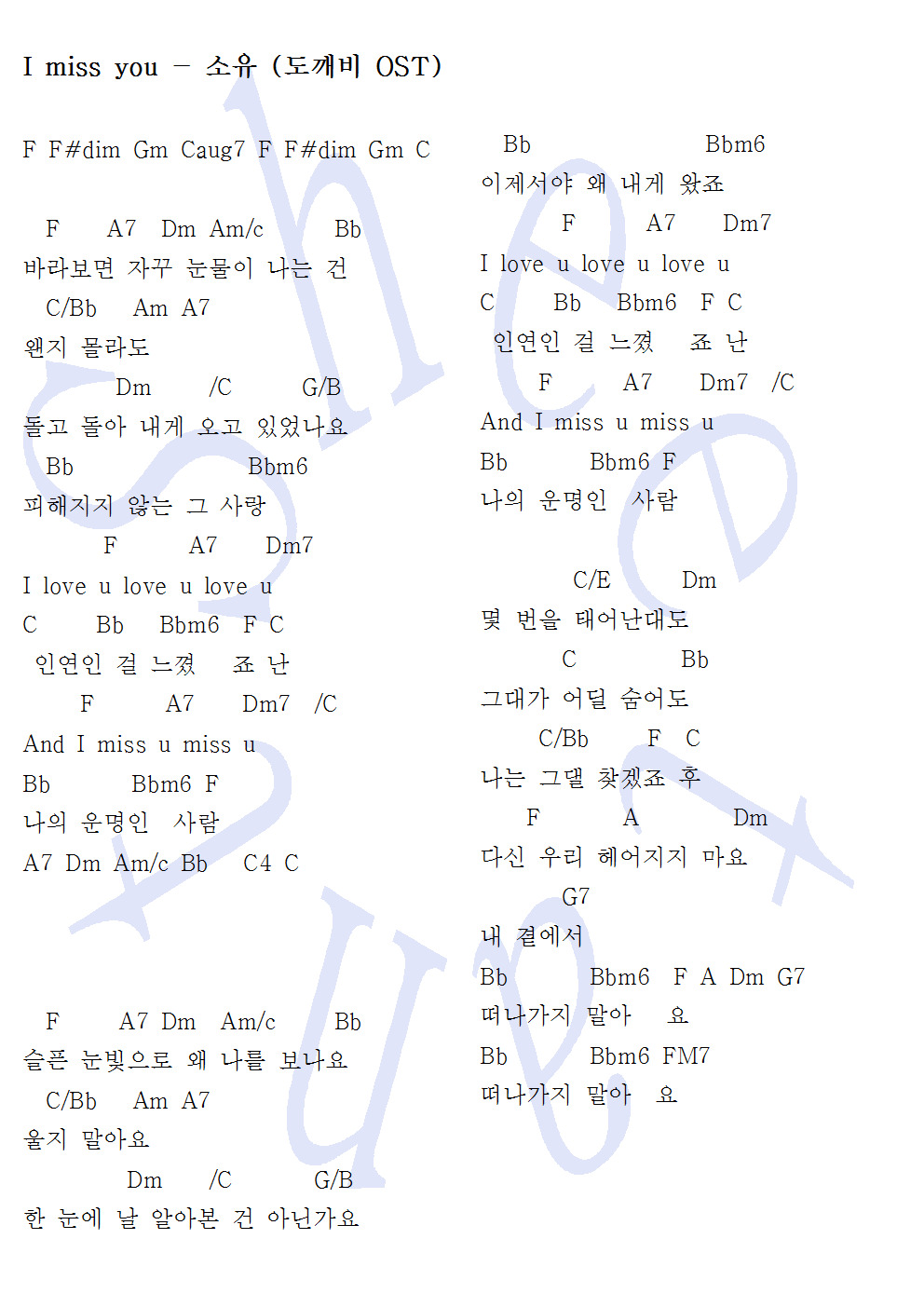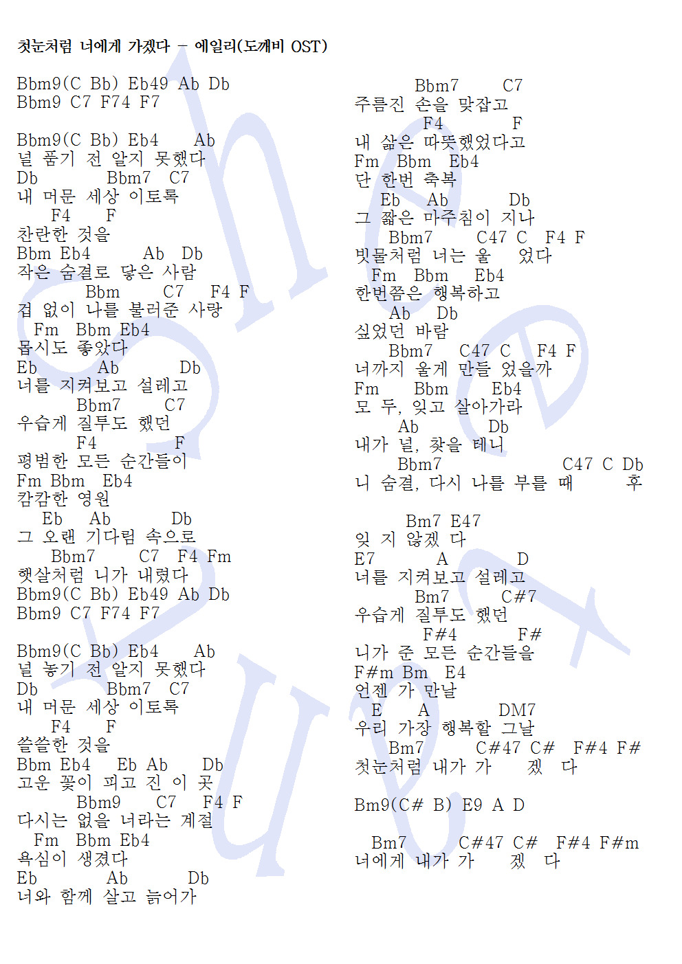 I miss you- 소유, 첫눈처럼 너에게 가겠다- 에일리(도깨비 OST)-1차수정 첫눈처럼 작성자Asura|작성시간17.02.08|조회수5,000 목록 댓글 2 글자크기 작게가 글자크기 크게가 근 반년만에 올리네요. 아는분이 부탁해서 듣고 딴악보 참고하고 해서 대강 땄습니다.(드라마 좋더군요. 으으음.)바꿀 부분 이상한 부분 있으시면 꼬릿말 다시어요. 수정할게요. 다음검색 현재 게시글 추가 기능 열기 북마크 공유하기 신고 센터로 신고 댓글 댓글 2 댓글쓰기 답글쓰기 댓글 리스트 작성자정동연 | 작성시간 17.06.27 감사합니다! 답댓글 작성자Asura 작성자 본인 여부 작성자 | 작성시간 20.10.15 별말씀을요.^^ 댓글 전체보기