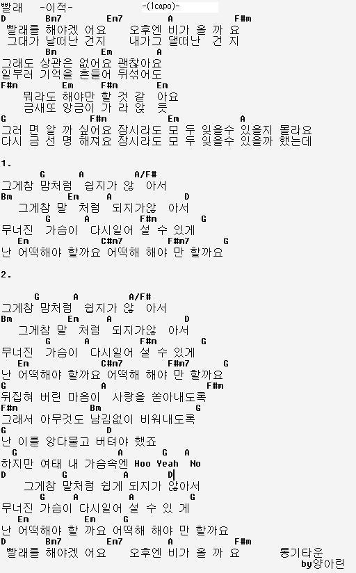 (요청) 이적 -빨래 작성자양아린|작성시간10.10.10|조회수5,277 목록 댓글 12 글자크기 작게가 글자크기 크게가 맨날 좋은자료 가져만가다가 한번올려봅니다. 마..맞을려나? 해보니 보통작업이 아니더군요 안녕나의 주말 다음검색 현재 게시글 추가 기능 열기 북마크 공유하기 신고 센터로 신고 댓글 댓글 12 댓글쓰기 답글쓰기 댓글 리스트 답댓글 작성자양아린 작성자 본인 여부 작성자 | 작성시간 10.10.14 저도쫌 괴상하다고 생각은했었는데 ㅋㅋ 감사해요 작성자Asura | 작성시간 10.10.14 별말씀을. 어디까지나 제 사견입니다. 좋은 악보 감사합니다. 작성자핫핫핫 | 작성시간 10.10.23 진짜로감사합니다ㅎㅎㅎㅎㅎㅎㅎㅎ 작성자장유진 | 작성시간 10.12.08 대박!!!!!!!!!!!!!!!!!!!!!감사해여! 작성자양빵 | 작성시간 11.08.15 우왕!! 감사합니당~~~!!!^0^ 댓글 전체보기