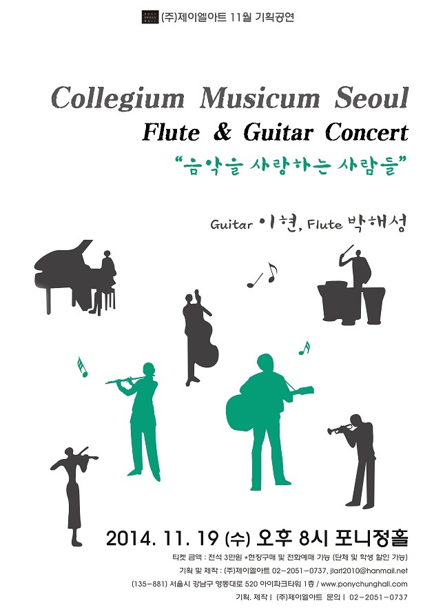 <ARTIST> Guitar 이현 - 피어선대학교 기타과 졸업 - 독일 베를린 국립음대 Hans Eisler 졸업 및 최고연주자 과정 졸업 - ZDF 방송교향악단, 내셔널심포니오케스트라, Justus Franz과 협연 - 1996-2001 베를린대학 기타학부 지정 실내악 협연주자 - Bonn 기타축제 초청연주자 - 독일 Brandenburg Neustrelitz 음악원, Mirow 음악원 기타과 출강 - 現) 기타리스트로서 독일 베를린을 중심으로 활동 ‘Tedeska’ 대표 Flute 박해성 - 한양대학교 음악대학 관현악과 졸업 - 프랑스 젠느빌리에 국립음악원 최고연주자과정 졸업 - 중앙일보 ‘스테레오 뮤직’ 필자 및 매일경제신문 문화부 객원기자 역임 - 국내는 물론 프랑스, 스페인, 루마니아, 미국, 중국, 일본 등지에서 협연, 독주회 및 실내악 연주 무대를 가짐 - 現) 서울종합예술학교(Seoul Arts College) 강의전담 교수 KFEA 한국플루트교육자협회 발기인 및 상임이사 뉴욕썸머뮤직페스티벌 NYSMF IFI 교수진 도서출판 FLUTEHOUSE, 매거진 ‘FLUTE&’ 대표