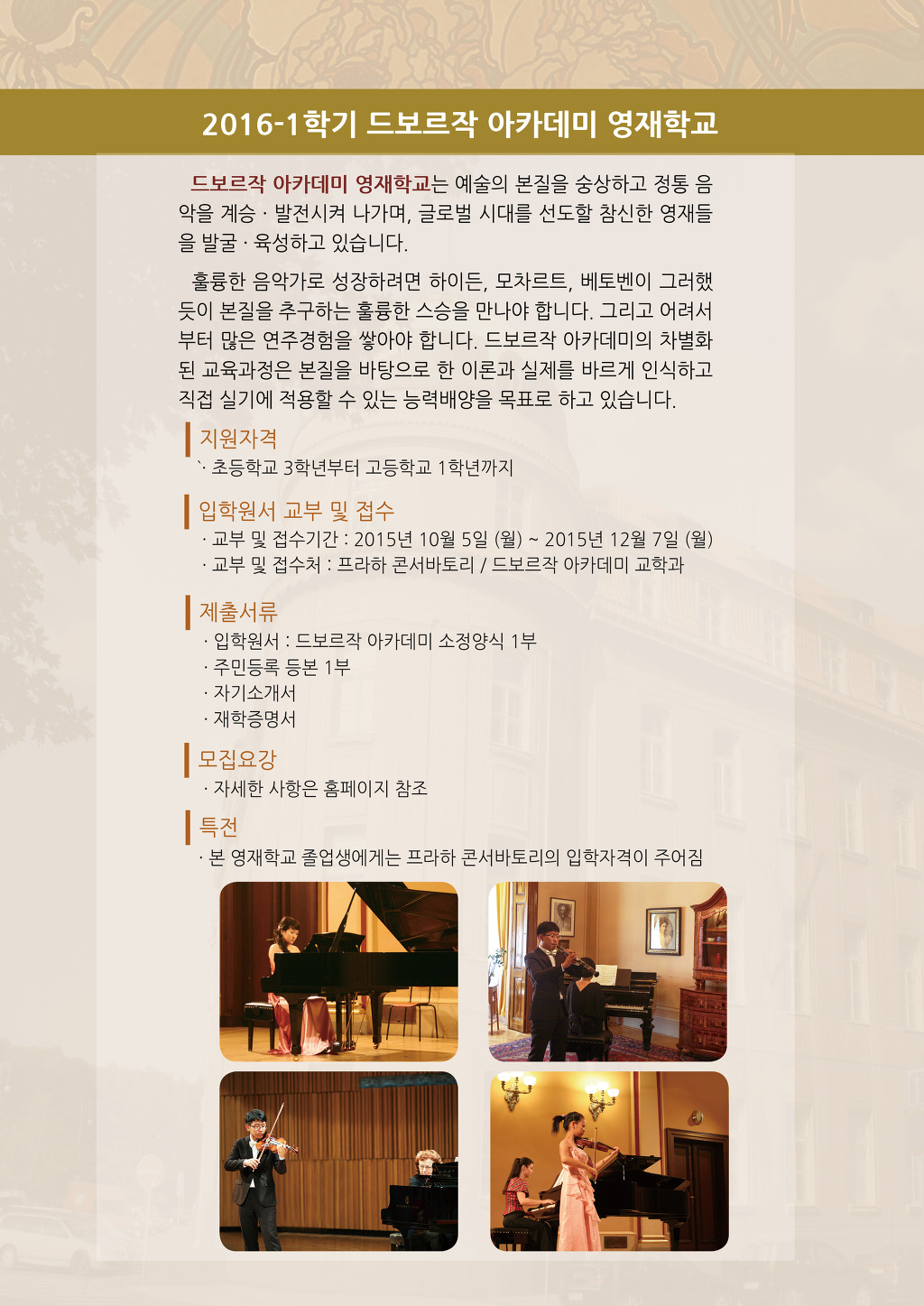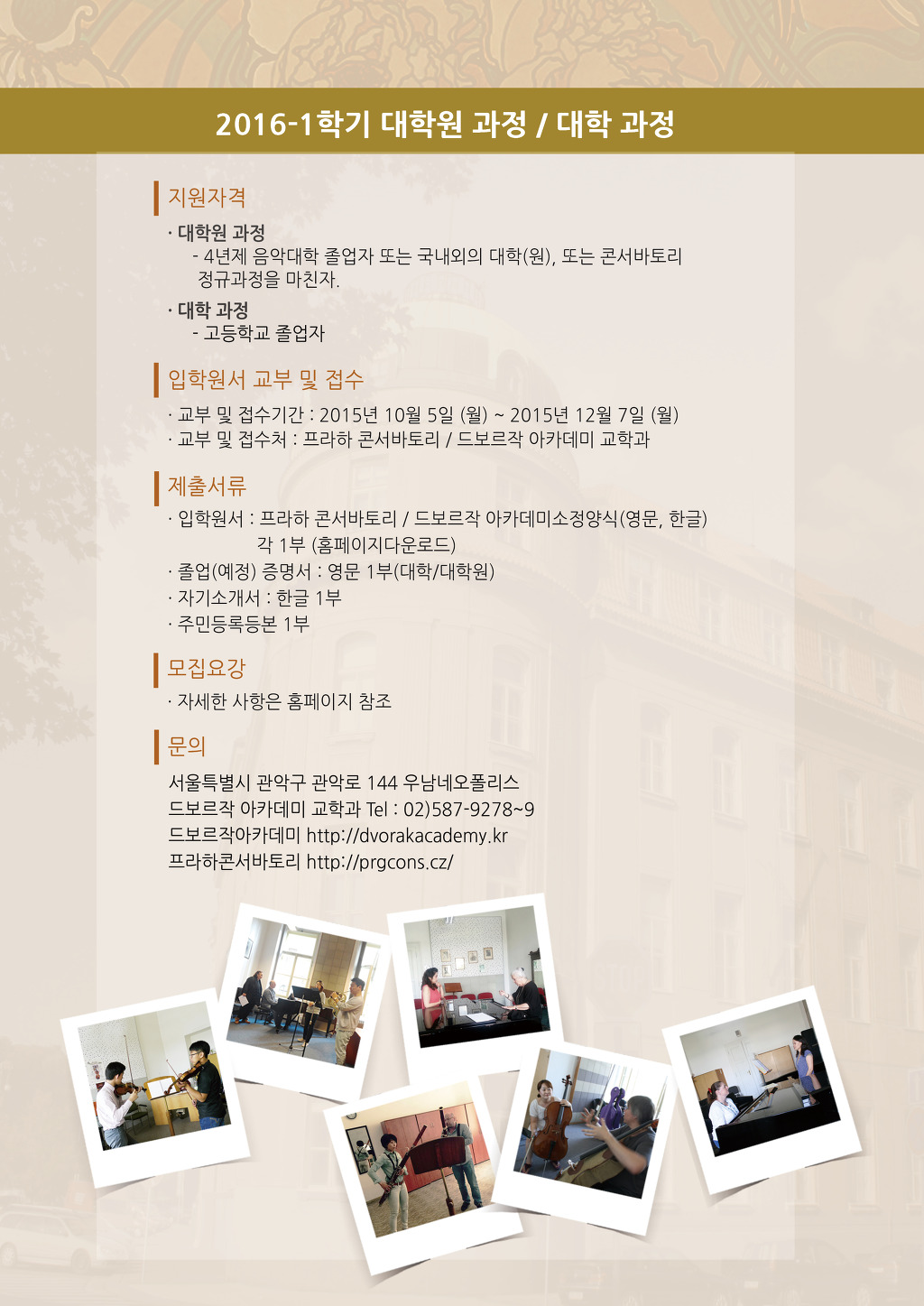 2016-1학기 프라하콘서바토리 / 드보르작 아카데미 입학안내(클래식기타전공있습니다.) 작성자떠니|작성시간15.11.09|조회수105 목록 댓글 0 글자크기 작게가 글자크기 크게가 다음검색 현재 게시글 추가 기능 열기 북마크 공유하기 신고 센터로 신고 댓글 댓글 0 댓글쓰기 답글쓰기 댓글 리스트