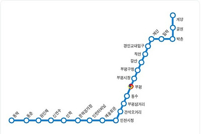 동막~동춘~원인재~신연수~선학~문학경기장~인천터미널~예술회관~인천시청~간석오거리~부평삼거리~동수~부평~부평시장~부평구청~갈산~작전~경인교대입구~계산~임학~박촌~귤현~계양