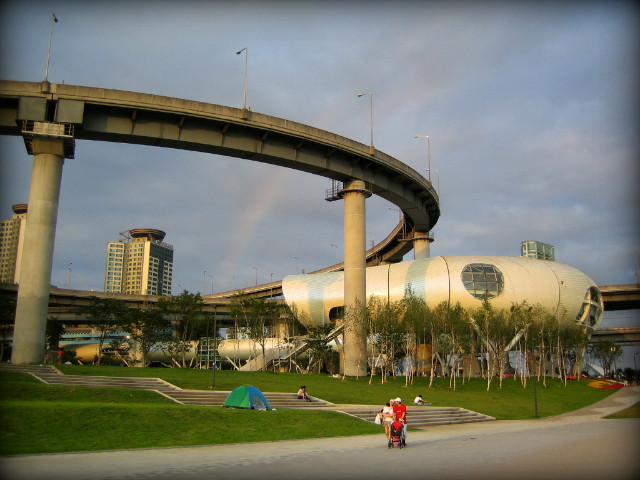 다리 옆으로 타원체의 건물은 J-BUG로 전시, 관람, 카페등 복합 문화공간이다.