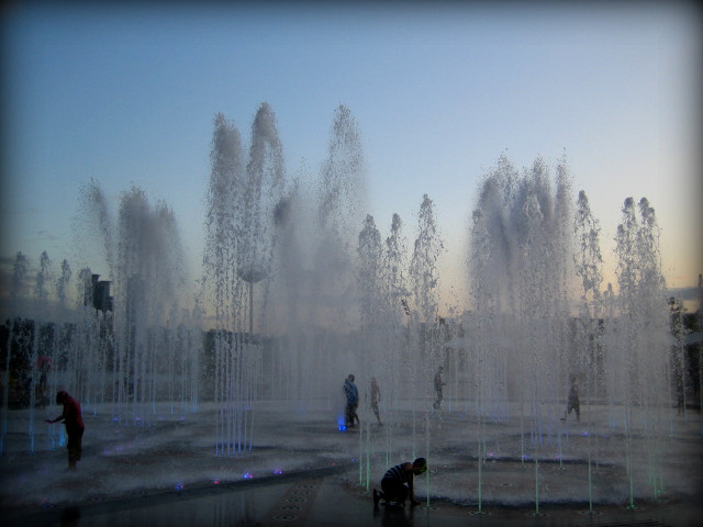 유원지 수영장 옆 광장에 있는 음악분수대. 야간에 조명을 받으면 좀더 아름답고, 어린 아이들이 없을 듯.