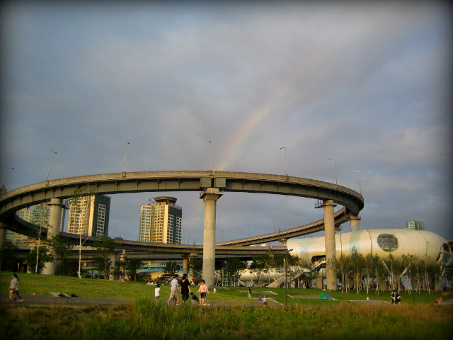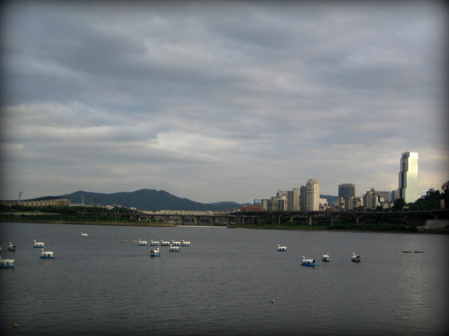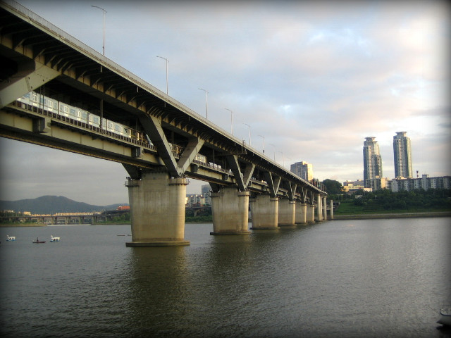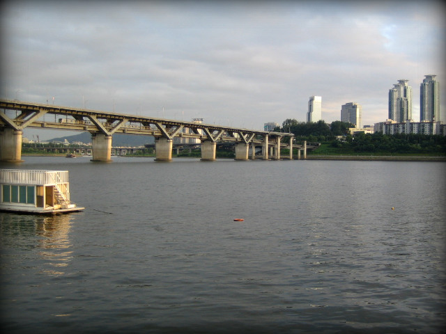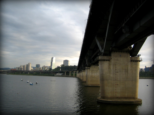 뚝섬 유원지역에 내려서자 마자 바로 마주하게 되는 전경. 청담대교의 모습과 저 멀리 무역센타 빌딩
