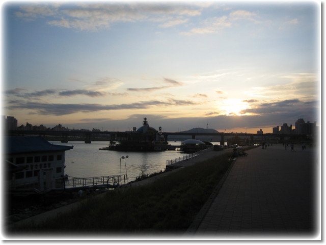 뒤를 돌아보니 석양에 물든 하늘 밑으로 남산 N타워와 영동대교의 모습