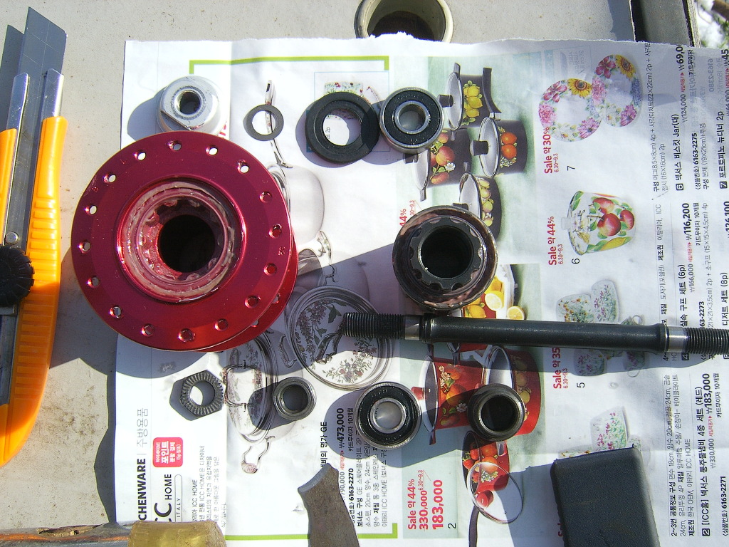전전 주인이 분해한다고 쇠망치로 뭉게버린 허브와 도라이버로 거칠게 분해하다 망가진 베어링 실드