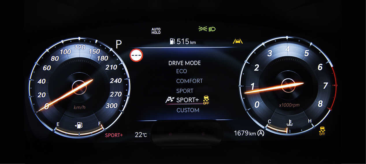 주행 모드에 따른 차량의 반응 변화 차이도 선명하다. 2023 G70의 주행 모드는 에코, 컴포트, 스포츠, 스포츠 플러스, 커스텀 등 총 5가지이며, 운전자 취향에 맞춰 조향 무게, 서스펜션 감쇠력, 엔진 및 변속기 반응 등을 통합 제어한다. 가령 에코 모드의 경우 가속 페달에서 발을 뗐을 때 스스로 기어를 중립으로 바꿔 활주 거리를 극대화해 연료 효율을 높이는 ‘코스팅 중립 제어’ 기능을, 스포츠 플러스 모드에서는 스포츠 주행에 적합한 기어 변속 시점과 함께 최대 가속 성능을 발휘하는 런치 컨트롤 기능을 각각 지원하며, 스포츠 주행을 위한 뒷바퀴의 미끄러짐(슬립)도 일부 허용한다.