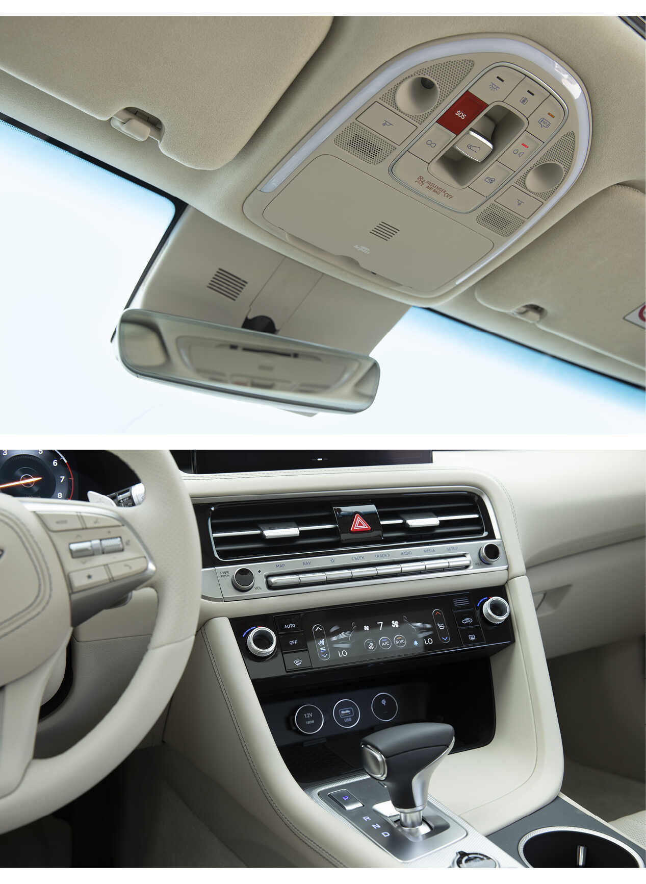 2023 G70는 베젤을 최소화한 심리스 디자인 룸미러와 함께 새로운 오버헤드 콘솔과 터치 디스플레이가 적용된 신형 공조 장치를 적용해 완성도를 끌어올렸다