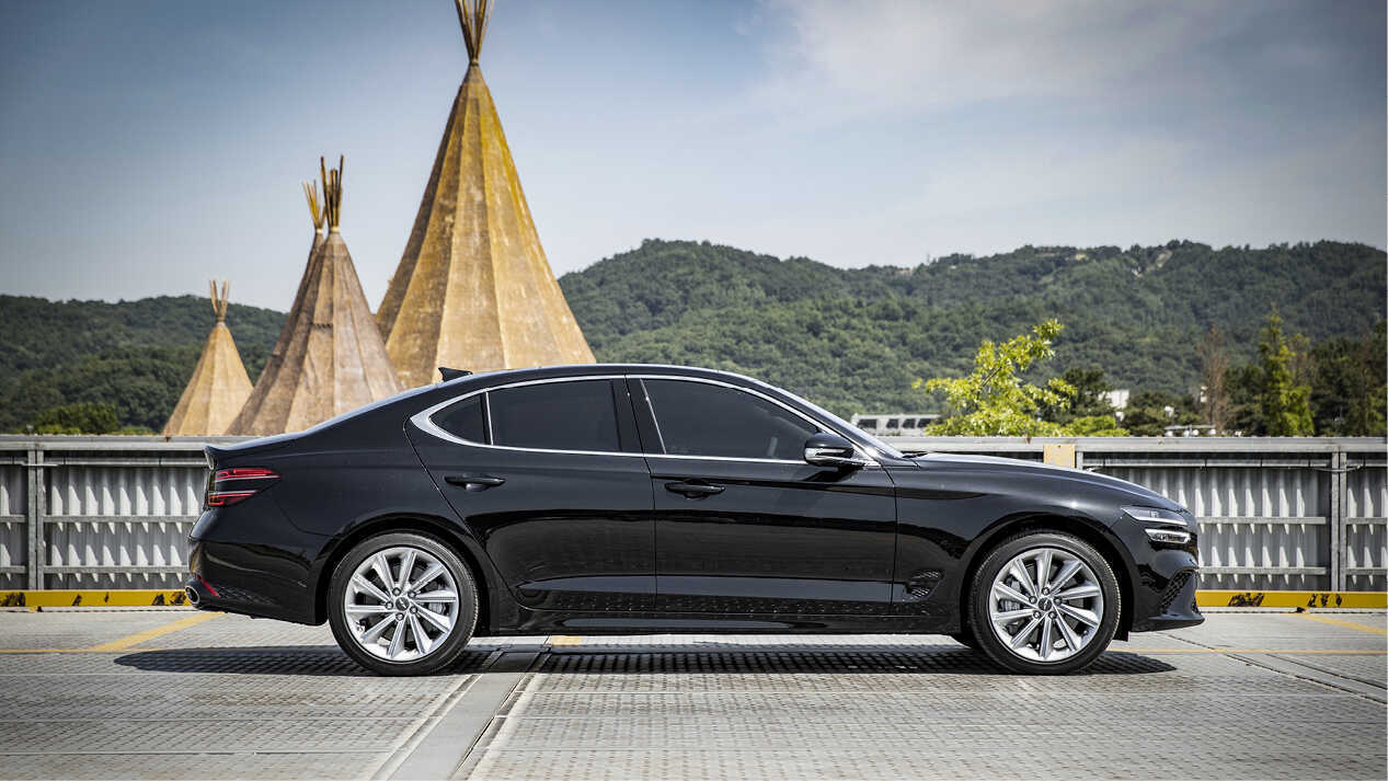 짧은 프런트 오버행과 긴 대시투엑슬(Dash to axle, 앞바퀴부터 운전대까지 거리)로 구현한 G70의 역동적인 측면 디자인