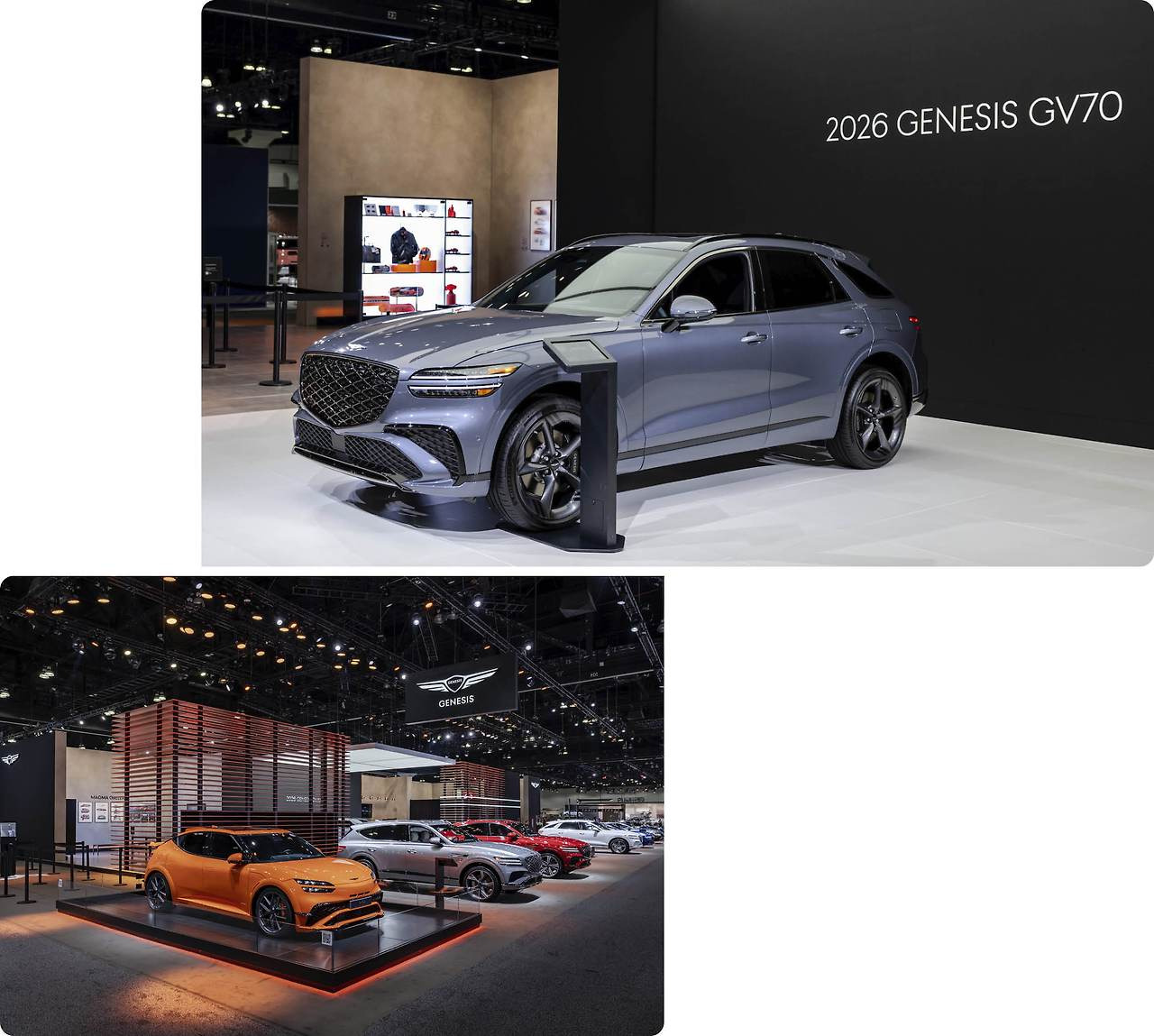 제네시스 브랜드는 내년 상반기 북미 시장에 출시할 예정인 GV70 부분변경 모델과 GV70 전동화 부분변경 모델을 무대에 올렸습니다. 두 모델은 모두 제네시스의 디자인 철학인 ‘역동적인 우아함’에 기반한 새로운 형상의 지-매트릭스(G-Matrix) 패턴 크레스트 그릴과 *MLA 헤드램프 등으로 세련된 감성을 강조했습니다.