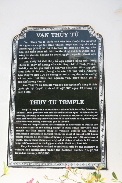 판 티엣에서 전통 산업인 어업과 관계가 깊은 역사유적을 꼽으라면 응으 옹(Ngo OAng, 어부라는 뜻)거리에 있는 반 투이 뚜(Vain Thuuy Tuu, 萬水秀, 실제 현판은 한자를 모르는 사람의 실수였는지 ‘萬’자의 좌측에 삼수변이 붙어있는 알 수 없는 한자와 ‘水’와 ‘秀’의 순서가 바뀌어 표기되어 있음.)사당을 들 수 있다. ‘반(Vain)’은 어부협회를 뜻하는 ‘반 짜이(Vain Chaøi)’에서 온 것으로 어부협회에서 이 사당을 건립했다는 것을 알 수 있다. ‘투이 뚜(Thuuy Tuu, 水秀)’는 아름다운 바다란 의미를 가지고 있으므로, 이 또한 어부의 생활과 관련이 깊다. 이 사당은 까 옹(Cau OAng, 고래)을 모시기 위해 1762년에 세워졌는데, 고래는 어부들에게 고기가 많은 곳과 태풍이 오는 것을 알려주는 영물로 인식되어 남 하이(Nam Haui, 南海)신으로 숭배를 받고 있다. 현재 100개 이상의 고래 해골들이 이곳에 보관되어 있는데, 이중 절반이상이 100년에서 150년 정도 된 것들이고, 가장 큰 고래 해골은 특별한 숭배대상으로 200년 정도 된 것이라고 한다. 응우옌왕조에서는 특별한 관심을 가지고 이 사당을 지원했었다. 그 이유는 떠이 썬(Taay Son, 西山) 농민반란 때 응우옌왕조의 장수와 군사들이 바다에서 고래로부터 수 차례 구조를 받은 적이 있었기 때문이다.
