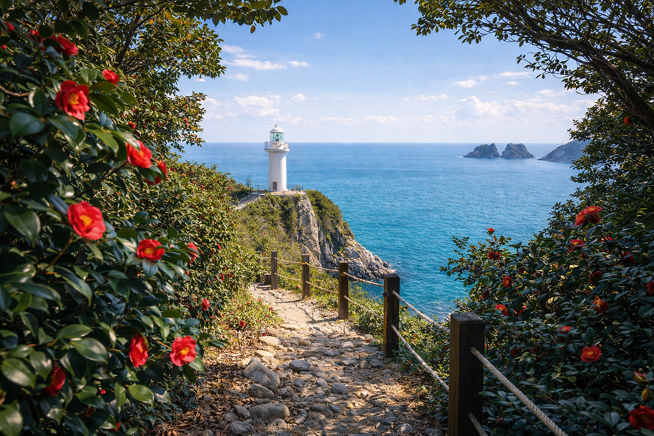 상록수림 안에는 수백년 된 동백나무가 빽빽히