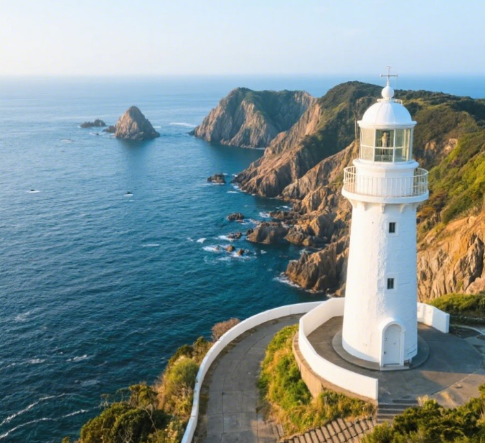 히노미사키 등대는 절벽 위로 솟아 있는 투박한 탑으로, 동아시아에서 가장 높은 등대이기도 합니다.