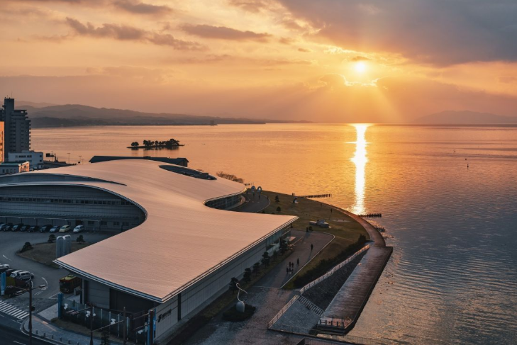 ▼신지코 호수에 지는 일몰을 감상하며 물과의 조화를 컨셉으로 한 시마네현립미술관