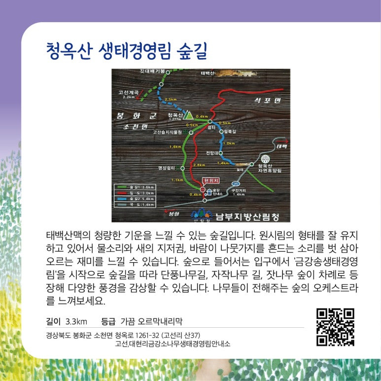 | 여행지 | 봉화 청옥산 생태경영림 명품숲길 ▷걷는 거리 : 8.5km 내외 / 완만한 오르막 연속 정상 원점회귀 등 ▷걷는 시간 : 약 4시간 내외(휴식포함) |