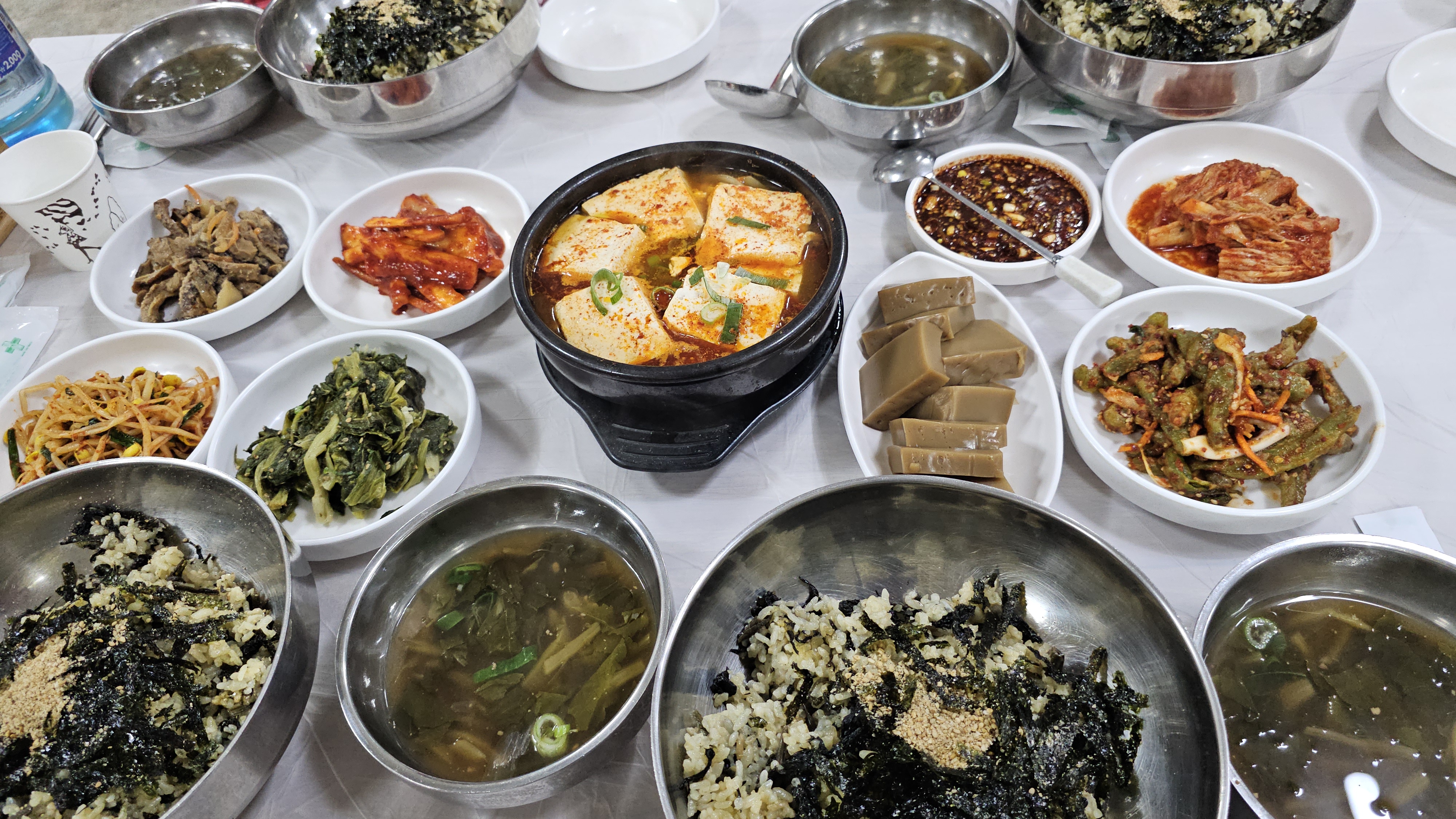 아침에 직접 만든 부드럽고 고소한 두부찌개, 찰진 도토리묵, 깔끔하고 맛난 반찬이 있는 건강 밥상입니다.