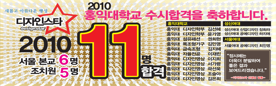 디자인스타 미술학원2010년 수시 홍대합격생입니다. 작성자유병훈|작성시간09.12.16|조회수229 목록 댓글 0 글자크기 작게가 글자크기 크게가 모두 모두 축하드리고요 디자인스타의 합격신화는 계속됩니다. 모두 응원 부탁드려용^^ 다음검색 현재 게시글 추가 기능 열기 북마크 공유하기 신고 센터로 신고 댓글 댓글 0 댓글쓰기 답글쓰기 댓글 리스트
