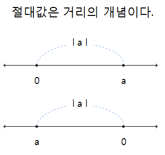 옆에서 말하는 것처럼 절댓값은 사실 거리의 개념입니다. 그래서 절댓값은 항상 양수가 됩니다.