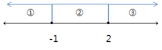 절댓값이 0이 되게 하는 a의 값 -1과 2를 구하고 수평선에 점 두개를 찍어 구간을 나누면 오른쪽 그림과 같습니다.