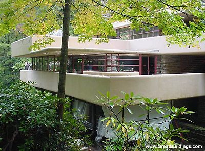 * 1935년에 프랭크 로이드 라이트가 피츠버그 백화점 사장을 위해 세운 낙수장은 라이트가 만든 것 들 중 가장 시적인 건축으로서 라이트의 로맨틱한 신념을 가장 완벽하게 표현한 것이다. 낙수장에서 사용된 주요 요소는 철근 콘크리트로 만들어진 슬래브로, 천장 역할과 바닥 역할을 동시에 하고 있다. 그 다음은 돌인데, 내외부의 석벽과 바닥은 시멘트와 대조적인 조화를 이루고, 마지막으로 유리막이 부여 되었는데, 이것은 연속 된 유리막 가운데 있는 고정 유리창과 결합되어 있다. 이 유리 커튼 월이 낙수장의 세 번째 주요 요소이다. 낙수장이 지형의 경사에 따라 한 층씩 뒤로 물러나 앉아 있듯이 유리막 또한 능수능란하게 다루어져 있고, 거실 주변의 유리막은 내부 공간의 구석마다 있는 기둥이 없이 3면이 연속해서 펼쳐져 있다.