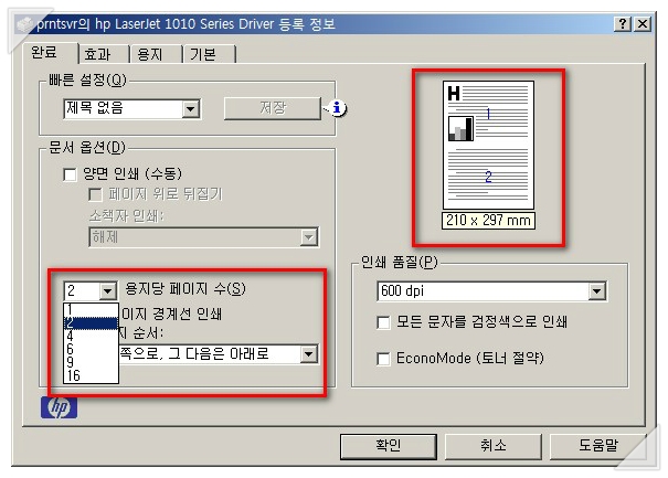 적색박스로 표시된 것 처럼 [용지당 페이지 수]를 설정하여 출력할 수 있습니다.