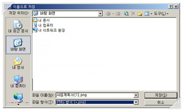파일 > 다른이름으로 저장 시에 확장자를 그림파일 (가능한 png를 이용하는 것이 좋습니다.)로 설정하여 저장합니다.