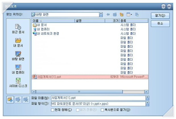 신기(?)하게도 한글 프로그램에서는 파워포인트 문서를 쉽게 읽어 들일 수 있습니다.