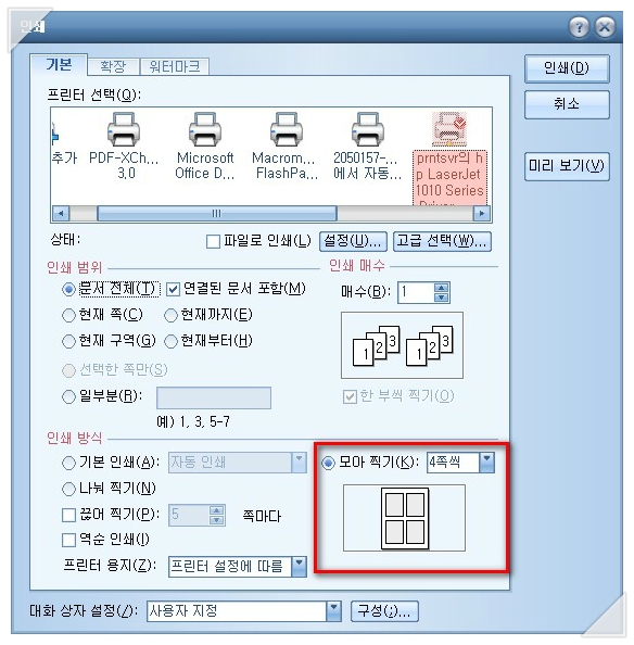 한글 프로그램 인쇄기능을 살펴보면 하단 우측에 [모아찍기] 기능이 있습니다.