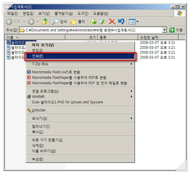이후에..그림으로 저장된 곳으로 이동하여 저장된 슬라이드그림 파일을 모두 선택 한 다음 오른쪽마우스 클릭 > 인쇄 를 선택합니다.