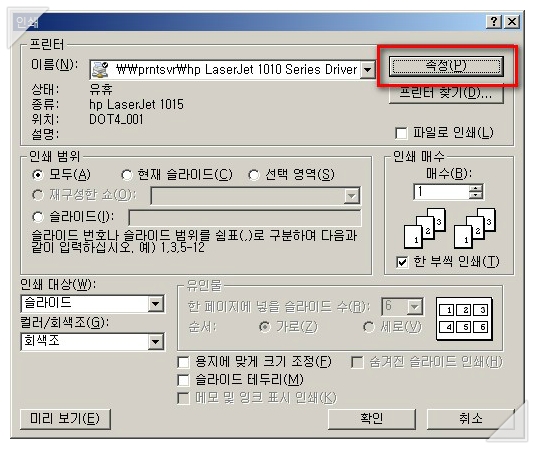 파워포인트의 인쇄기능을 누른 후에..상단에 나타나는 프린터 속성 버튼을 누릅니다.