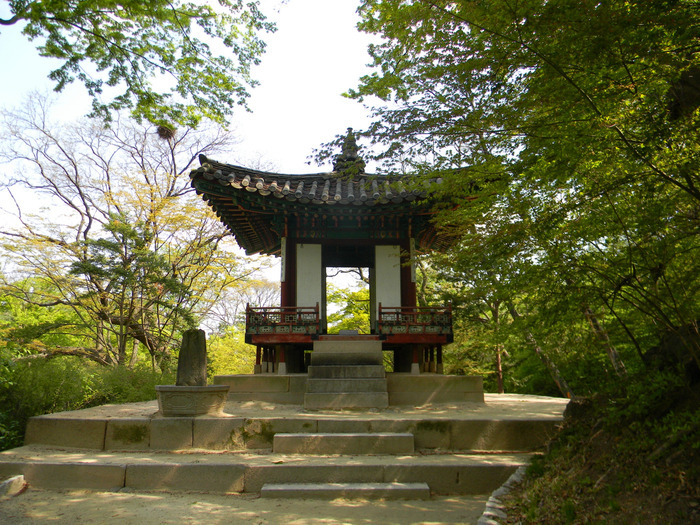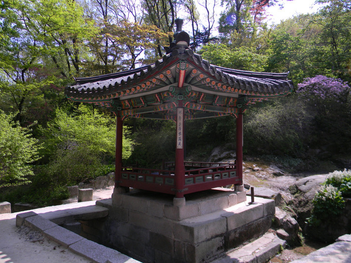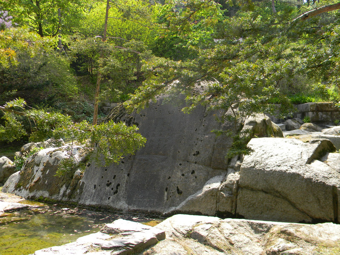 ▲ 청의정의 북쪽 모습과 돌다리 청의정 정면(북쪽)으로 단순한 모습의 작은 통돌 돌다리를 두었다. 다리가 짧아서 그 옆으로 점프해서 넘어가도 되지만 돌다리와 청의정 내부는 금지 공간으로 묶여있어 들어갈 수 없다. ▲ 옥류천 반석에 덩그러니 놓인 수상한 돌지붕 계곡 반석에 돌지붕 하나가 바짝 엎드려 있다. 보아하니 주변에 있던 석등 같은 돌덩어리의 지붕돌 같은 모습인데, 그는 어디서 왔고, 정체가 무엇이며, 왜 이곳에 있는지는 모르겠다. ▲ 옥류천 소요암(逍遙岩) | |