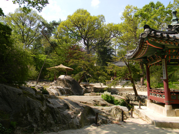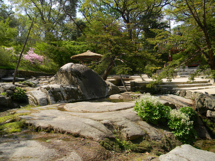 | 옥류천 구역은 창덕궁 후원에서 가장 구석진 곳으로 후원 동북쪽 끝에 자리하고 있다. (후원 의 서북쪽 끝은 다래나무가 있는 곳) 돈화문(敦化門)에서 약 1.4km, 함양문(咸陽門) 옆 후원 입구에서 1km를 들어가야 닿을 수 있 는 깊은 골짜기로 북악산(백악산) 동쪽 봉우리인 응봉(와룡산) 자락에서 발원한 계곡과 후원 내에서 발원한 물이 이곳에서 만나 옥류천을 이룬다. (이곳 일대 계곡을 옥류천이라 부름) 옥류천이 언제부터 쓰였는지는 알 수 없으나 세조 때 후원을 크게 넓힌 이후, 제왕의 휴식처 로 가끔씩 쓰였던 것으로 여겨지며, 옥류천이란 이름과 현재 옥류천 구역은 병자호란 직전인 1636년에 인조가 닦았다. 그는 이곳 풍경에 퐁당 반하여 소요암을 건드려 그 위에 홈을 파서 물길을 냈으며 그 물길을 밑으로 가게 하여 작은 폭포를 빚었다. 그리고 그 주변으로 태극정 과 청의정, 소요정 등을 닦았다. 옥류천 구역에는 소요정과 태극정, 농산정, 취한정, 청의정 등의 작은 정자들이 숲과 조화를 이루며 상큼하게 자리해 있고, 청의정은 조선 궁궐 유일의 초가 정자로 그 주위로 작게 논을 지니고 있다. 소요암에는 인조의 친필이라는 옥류천 바위글씨와 숙종이 지은 오언절구 시가 깃들여져 있으며, 구불구불한 물길에 술잔을 띄우고 시를 지으며 연회를 즐긴 이른바 유상곡 수연(流觴曲水宴)이 여기서 종종 열렸다. 1884년 12월 갑신정변(甲申政變) 때 명성황후(明成皇后)의 지시를 받은 청나라군이 김옥균(金 玉均)과 박영효(朴泳孝), 홍영식(洪英植) 등의 정변 패거리를 잡고자 창덕궁을 공격했는데, 정변 패거리와 그들을 도우러 온 왜군이 이를 감당하지 못하고 고종과 왕족을 호위하며 옥류 천을 지나 후원 북문인 북장문(北牆門)을 통해 창덕궁 밖으로 도망친 흑역사가 있다. 순종은 옥류천을 즐겨 찾아 여기서 망중한을 달랬으며, 창덕궁이 속세에 해방된 이후에도 이 곳만큼은 존재를 숨기며 오랫동안 금지 구역으로 묶였다. 그러다가 부분 개방으로 비로소 속 세에 열린 것이다. (공개하지 않는 경우도 종종 있음) 옥류천 북쪽에는 창덕궁과 속세의 경계를 긋는 돌담(후원 북쪽 돌담)이 있는데, 옥류천과 돌 담 사이의 거리는 40~50m 정도로 숲이 우거져 있다. 옥류천과 돌담 사이 숲은 접근이 통제되 어 있으며, 그 돌담 너머로 성균관대가 살짝 모습을 보인다. 그리고 성균관대에서 후원 북쪽 돌담길을 통해 북촌(北村)과 삼청동(三淸洞)으로 넘어갈 수 있는데, 이때 돌담 너머로 옥류천 구역 일부가 시야에 들어온다. 그동안 옥류천을 돌담 너머 로 살짝 본 것이 전부였으나 그 옥류천 현장에 나를 넣었으니 정말 세상이 많이 바뀌었음을 실감한다. | |
