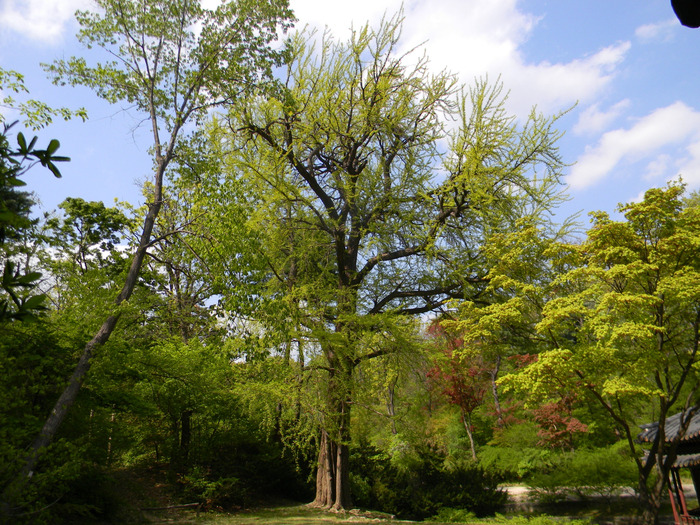 | 존덕정 뒷쪽에는 250년 정도 묵은 늙은 은행나무가 녹색 봄기운에 촉촉히 젖어있다. 그는 관 람정 구역에서 뽕나무(추정 나이 약 400년, 국가 천연기념물) 다음으로 늙은 자연물로 높이 22.4m, 둘레 5m의 준수한 덩치를 지녔는데, 정조가 존덕정을 정비하면서 기념으로 심었다. 존덕정에 일품 그늘을 드리우는 그는 동이족 출신의 사상가인 공자(孔子)의 행단(杏壇) 이야 기에 따라 학문 장려 차원에서 심었다는 이야기도 있다. | |