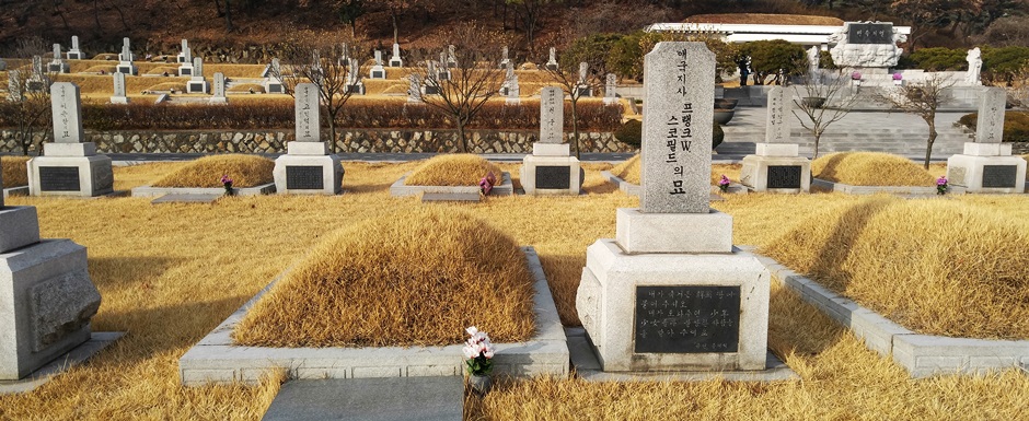 애국지사 묘역에 모셔진 프랭크 스코필드 박사는 영국계 캐나다인으로서 1916년 당시 한국 세브란스 의학전문학교(연세대학교 의과대학의 전신) 교장으로 있던 에비슨(Avison, O. R.)의 초청으로 세균학 교수로 한국에 들어왔다.